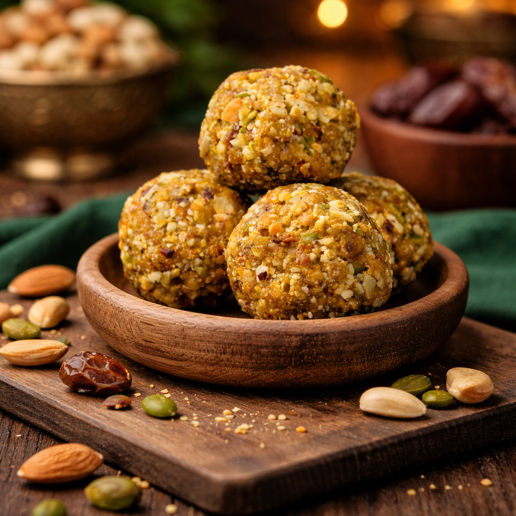 Our sugar-free dry fruit laddoos are naturally sweetened with high-quality dates and packed with nutrient-rich dry fruits like almonds, cashews, pistachios, raisins, figs, and super seeds. Every bite delivers natural energy, protein, fiber, and healthy fats — making it an ideal alternative to traditional sweets.